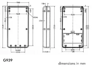 These cases resemble the enclosure of a large multimeter. They include a battery compartment and the tilting bail is standard. The G900-series is available with or without a cutaway for the display. The top and bottom parts are equipped with a tongue and groove sealing system that permits gasketing. The gasket is available as a separate item. The durable and professionally moulded tilting bail can also be used to hang the enclosure on a nail in the wall. The two halves of the enclosure are held together by 4 brass inserts in the lid and by M3 screws (supplied).