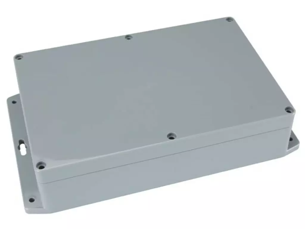 These enclosures consist of high-impact ABS (operating temperature : -20°C to +80°C). The lid and the base are equipped with mounting flange and groove sealing system with a neoprene gasket. The flanged wall mounting holes are designed for M3 self-taping screws. The bosses inside of the base are designed for M2.6 self-taping screws. Designed to meet IP65 of IEC529 and NEMA4 (dust- and hoseproof). Internal guide slots for mounting PCB assemblies vertically. Also available with clear lid (on demand).