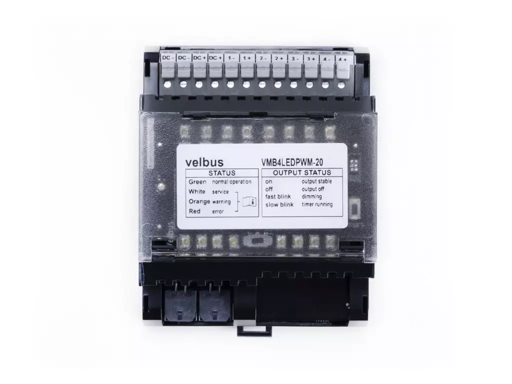 This next generation LED dimmer module features 4 synchronised output channels for LED strips. It features native Velbus integration, so a seperate PWM dimmer controller is no longer required. Each channel allows up to 120W of power to be delivered to your LEDstrips. Thanks to the error detection, overload protection and overvoltage protection, your LEDs are safe to be controlled directly with Velbus!