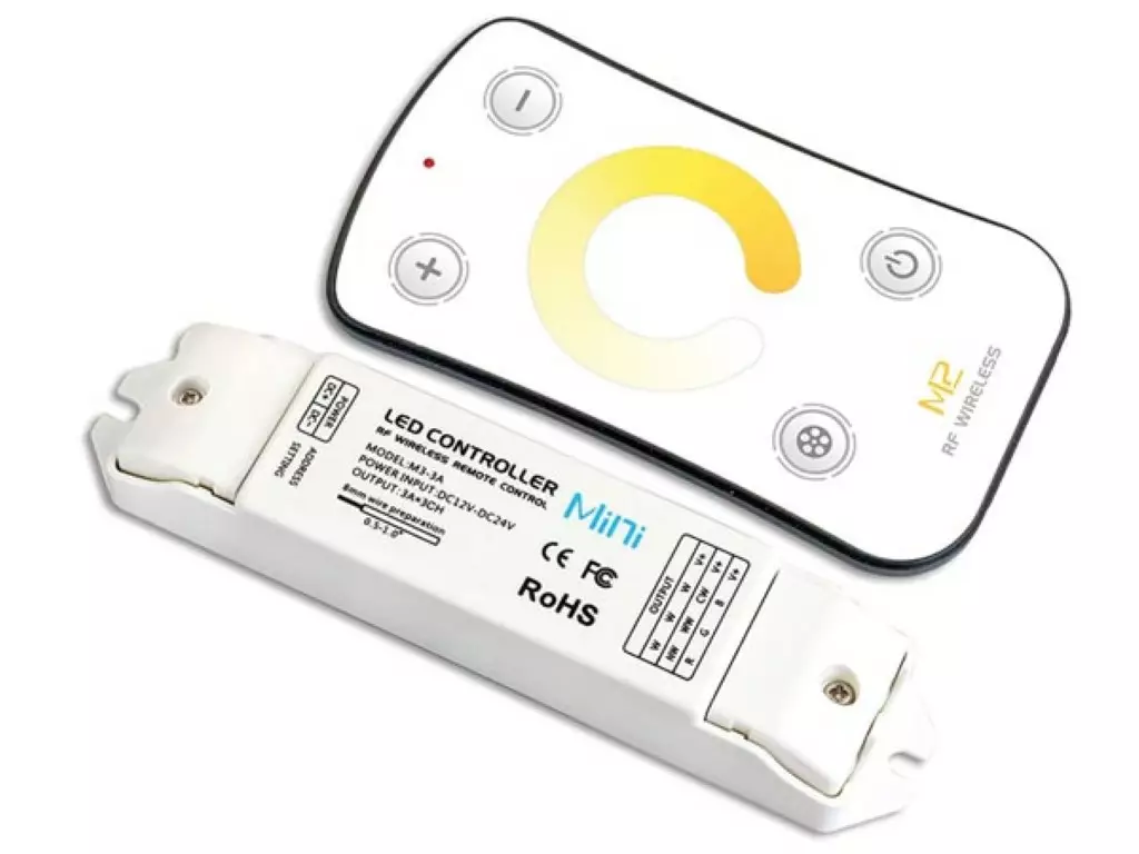 Värilämpotilan säädöllä oleva kauko-ohjattava yksikanavainen himmennin 12/24V LED nauhoille. Pienikokoinen, helppokäyttöinen kauko-ohjain jossa pitkä kantomatka(40-50m). Maksimikuorma 3 x 3A.