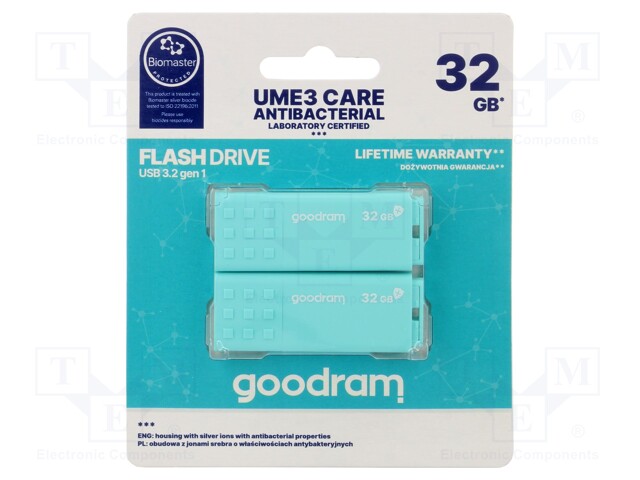 Valmistaja GOODRAM Muistin kapasiteetti 32GB Versio USB 3.2 Väri minttu Tiedontallennusvälineen tyyppi pendrive Liittimen laji USB A Lukumäärä sarjassa/pakkaus 2kpl Tallennusnopeus 20MB/s... Lue lisää